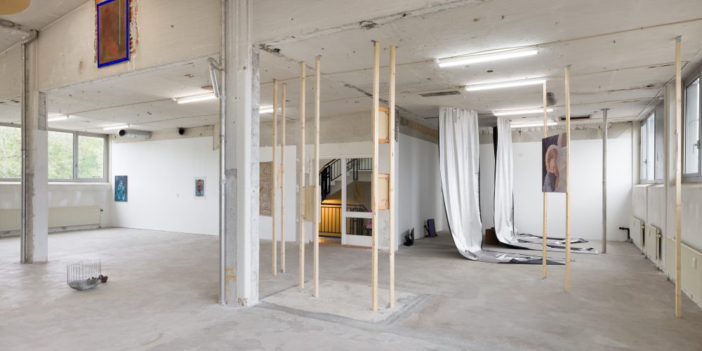 Feeding, eating, talking, Lisen Larsen. Akryl på lærred, pigment på kalk,farveblyant på papir, trælægter, tegning af Della-Bee Larsen, 2021.